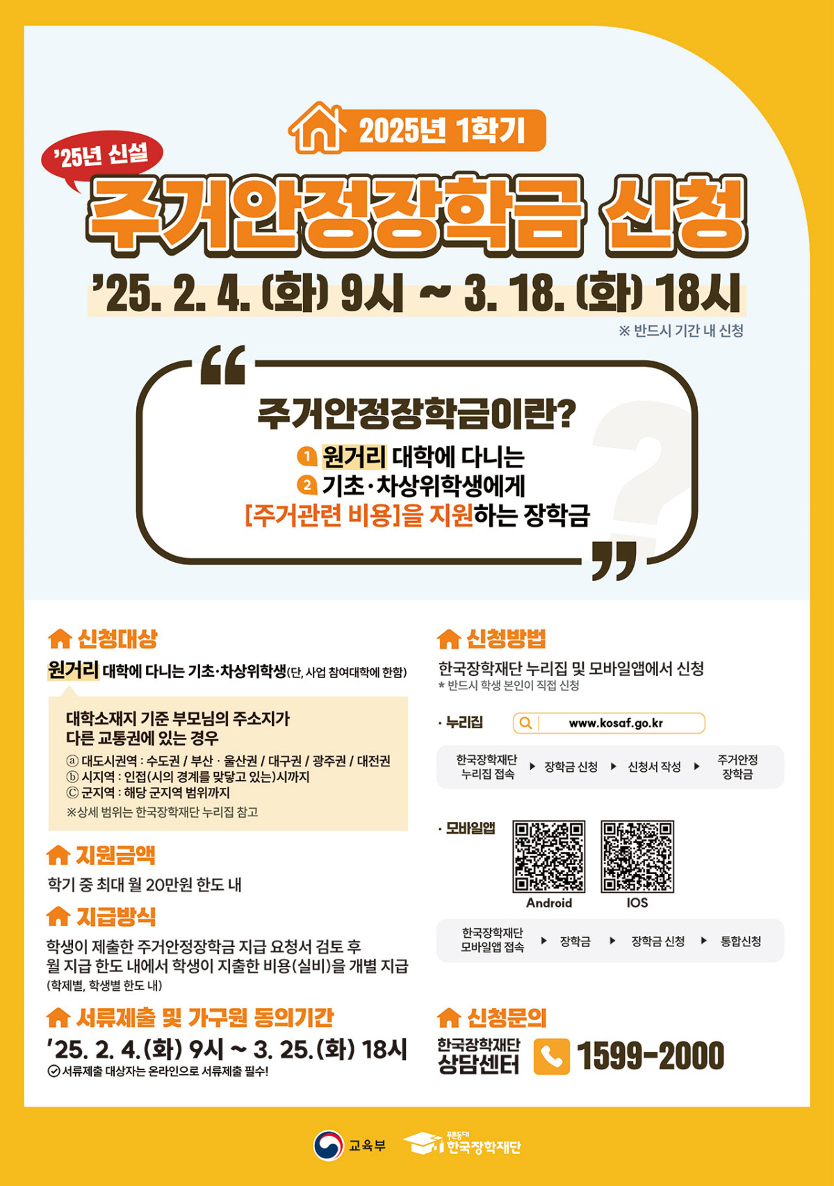 2025년 1학기 주거안정장학금의 신청 기간은 2025년 2월 4일부터 3월 18일까지예요. 이 기간 동안 신청서를 제출해야 하니, 미리 준비해두는 것이 좋겠죠? 특히, 서류 제출 및 가구원 동의가 필요하니, 이 점도 잊지 말고 체크해 주세요.